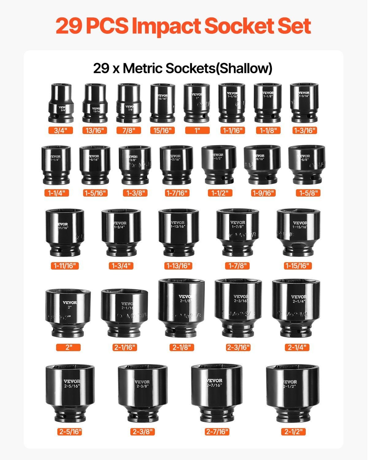 This effort-saving 3/4" drive shallow impact socket set comes with 29 impact drive sockets in different sizes for you to choose.